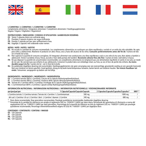 HIGH DOSED: L-carnitine with 680 mg per daily dose of L-carnitine tartrate with a 68% L-carnitine content. 120 VEGANE capsules for 2 months continuous supply of L-carnitine.